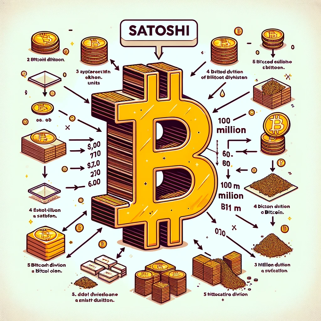 위 이미지는 비트코인의 가장 작은 단위인 '사토시'의 개념을 설명하기 위해 만들어졌습니다. 이미지에서는 큰 비트코인 심볼이 1억 개의 작은 단위로 나누어지는 과정을 보여주고 있으며, 각각의 작은 단위가 '사토시'로 표시되어 있습니다. 이 도표를 통해 비트코인이 어떻게 작은 단위로 나누어질 수 있는지 쉽게 이해할 수 있습니다.